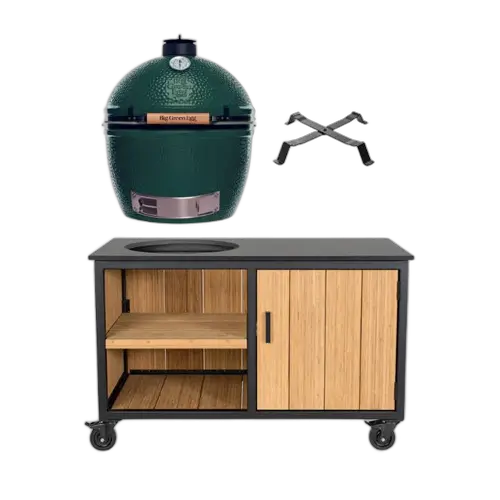 Big Green Egg XLarge + Fraaii Buitenkeuken Bamboo Natural Storage XL is een mooie toevoeging voor elke tuin. Deze stijlvolle buitenkeuken biedt ruimte voor een kamado-barbecue en heeft een ruim werkblad. Dankzij de slimme opbergruimtes achter de kastdeur houd je al je kookgerei georganiseerd en binnen handbereik. Deze Fraaii buitenkeuken is geschikt voor kamado’s van 23 t/m 25 inch.