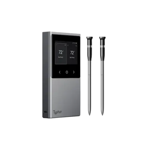 De Typhur Sync Dual is een slimme thermometer voor wie graag meerdere stukken vlees tegelijk bereidt. Deze thermometer heeft twee probes (de metalen pennen die je in het vlees steekt), elk met 6 ingebouwde sensoren. Vijf sensoren meten de interne temperatuur van het vlees, en één sensor meet de omgevingstemperatuur in je BBQ of oven. Zo houd je alles perfect in de gaten — vanbinnen én rondom je gerecht.
